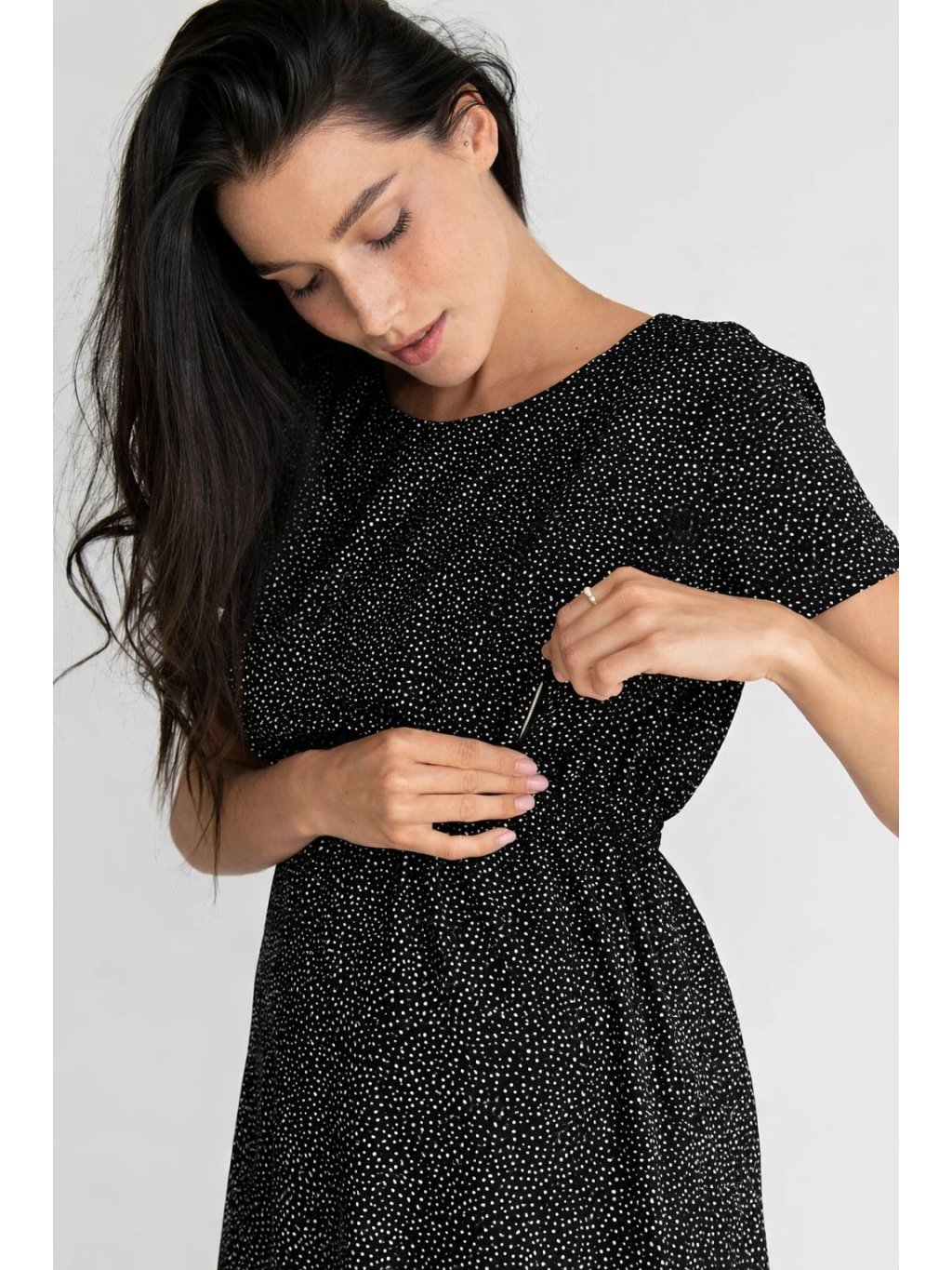Šaty Viola v černé barvě jsou lehké a pohodlné těhotenské a kojicí šaty, které se díky volnějšímu střihu přirozeně přizpůsobí rostoucímu bříšku. Jemné bílé tečky dodávají šatům hravý, ale stále elegantní vzhled, který se hodí na běžné dny i letní výlety.