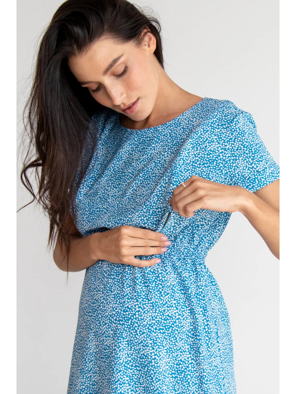 Viola v modré barvě jsou lehké a pohodlné těhotenské a kojicí šaty, které se díky volnějšímu střihu přirozeně přizpůsobí rostoucímu bříšku. Jemné bílé tečky dodávají šatům hravý, ale stále elegantní vzhled, který se hodí na běžné dny i letní výlety.
