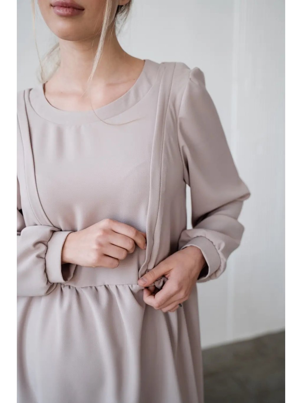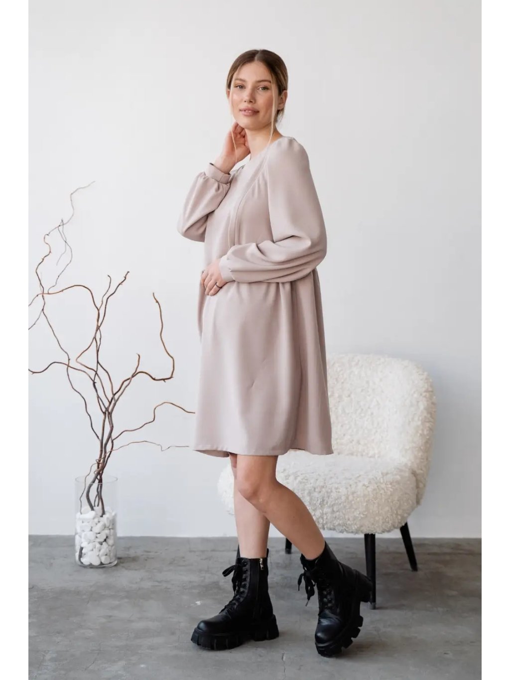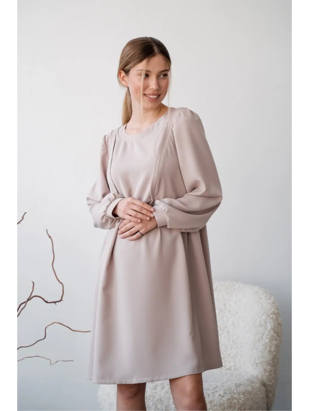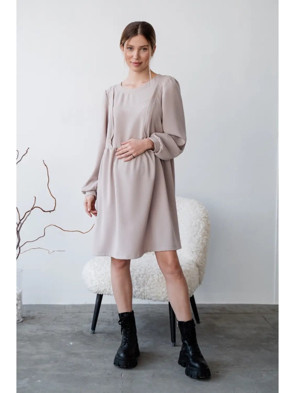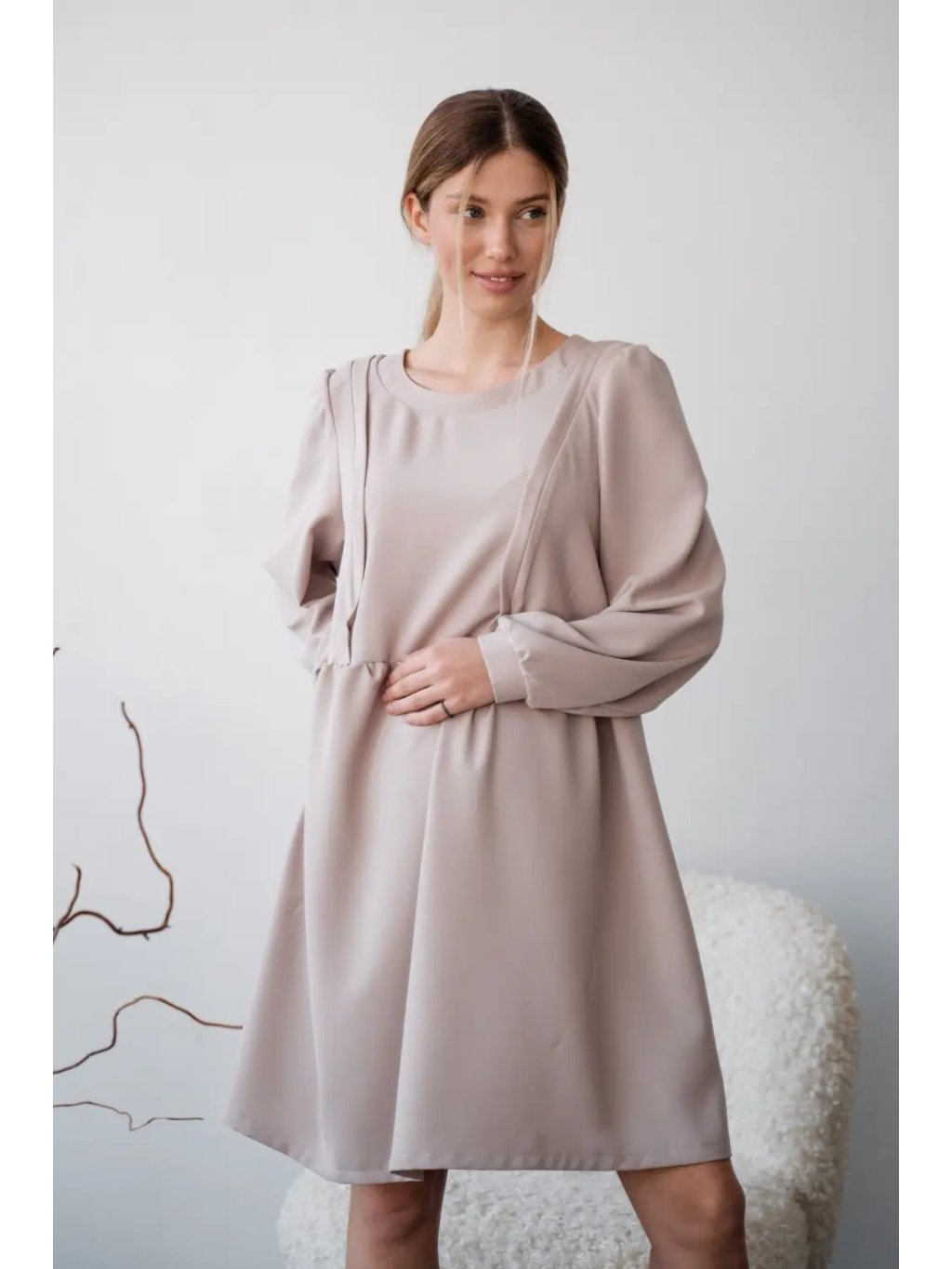 Vzdušné a pohodlné šaty pro těhotné v jemném taupe odstínu jsou navržené tak, aby doprovázely maminku v každé fázi mateřství. Volný střih z přírodního, příjemného materiálu poskytuje dostatek prostoru pro rostoucí bříško a zároveň krásně sedí i po porodu. Jemné řasení, kulatý výstřih a moderní rukávy dodávají šatům lehce romantický, ale stále nadčasový vzhled.
