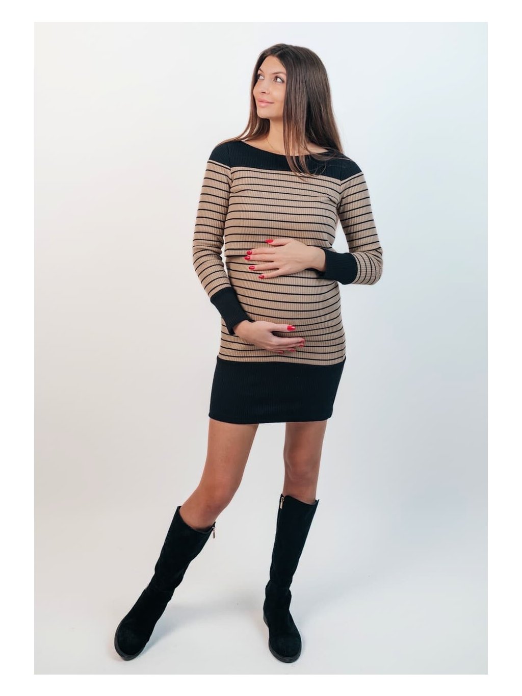 Těhotenské a kojicí svetrové šaty Rebbie 3v1 - pískové s černými proužky bavlněné