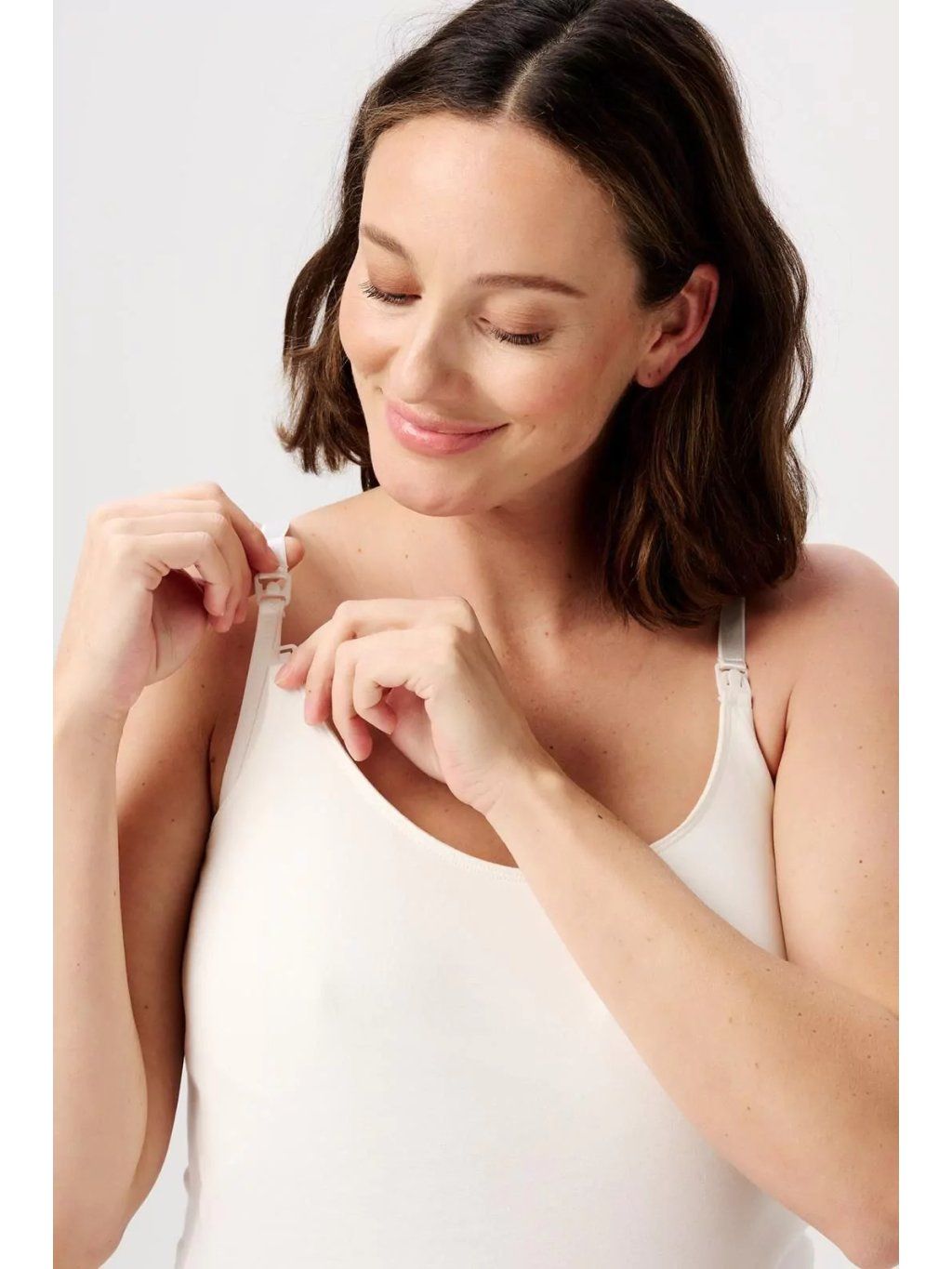 V období kojení usnadňují praktické odepínací klipy na ramínkách rychlý a diskrétní přístup. Uvnitř je všitý měkký vnitřní top s elastickým lemem, který pomáhá udržet vložky na místě a poskytuje jistotu při každodenním pohybu. Přiléhavý střih působí upraveně při samostatném nošení a snadno se kombinuje s dalšími kousky.