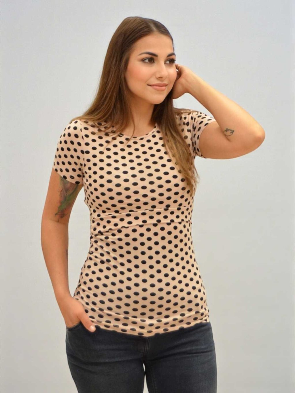 Pohodlné těhotenské a kojicí tričko 3v1 – béžové s puntíky