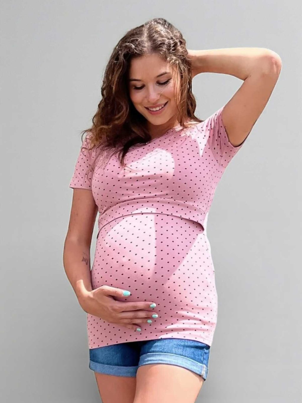 Toto krásné těhotenské tričko v odstínu herbal rose s drobnými černými puntíky je navržené tak, aby vás provázelo celým obdobím těhotenství. Pružný, příjemný materiál se dokonale přizpůsobí rostoucímu bříšku a poskytne pohodlí při každodenním nošení doma i venku.