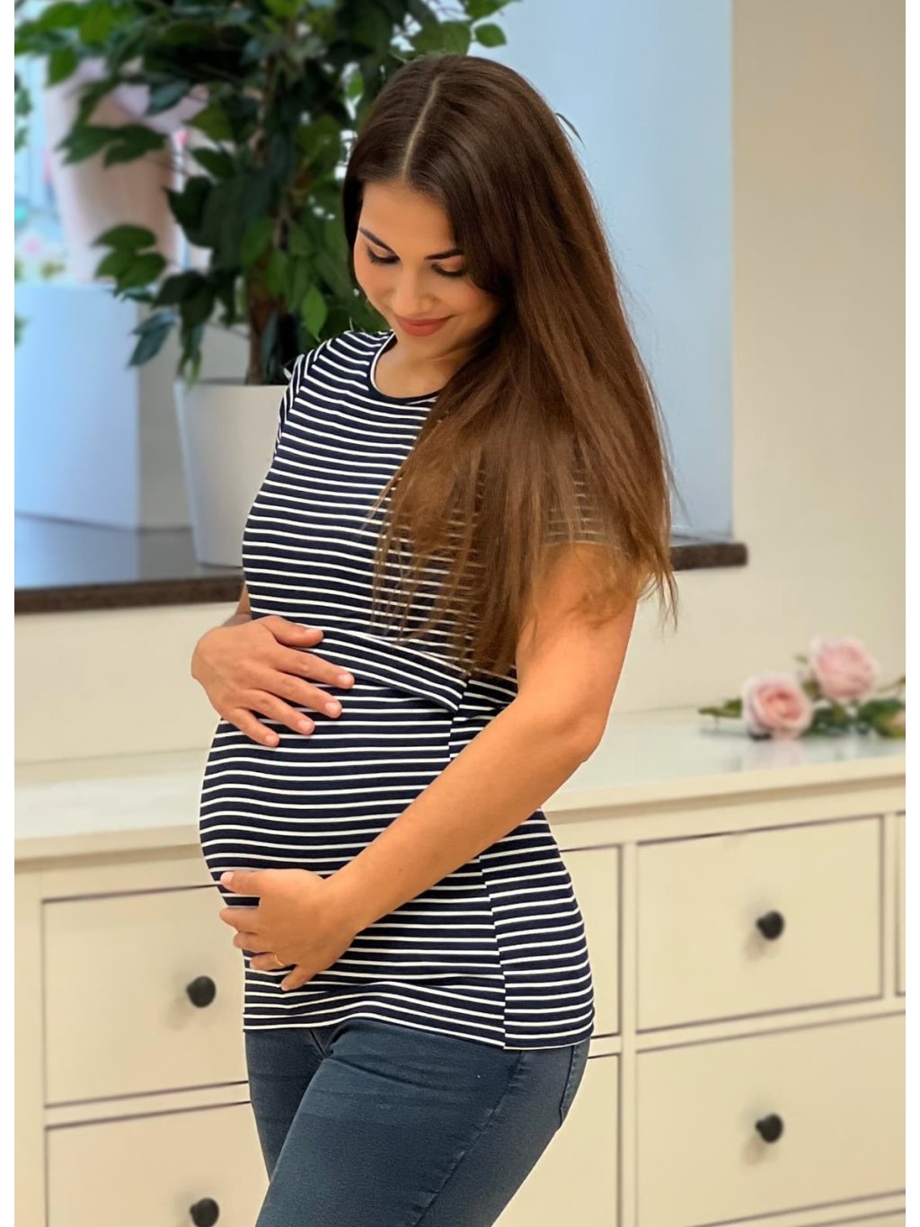 Těhotenské a kojící tričko 3v1 Mama L'amour tmavě modré s bílými proužky puntíky