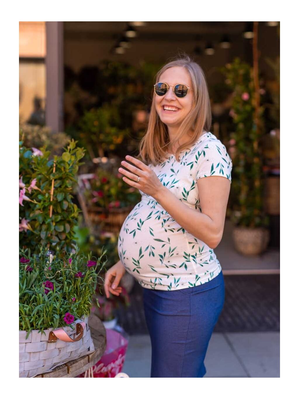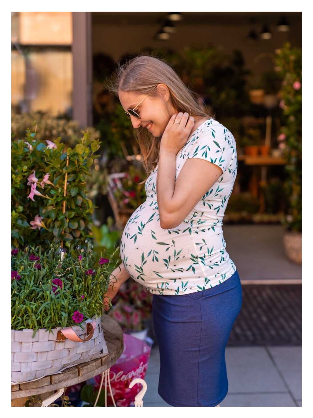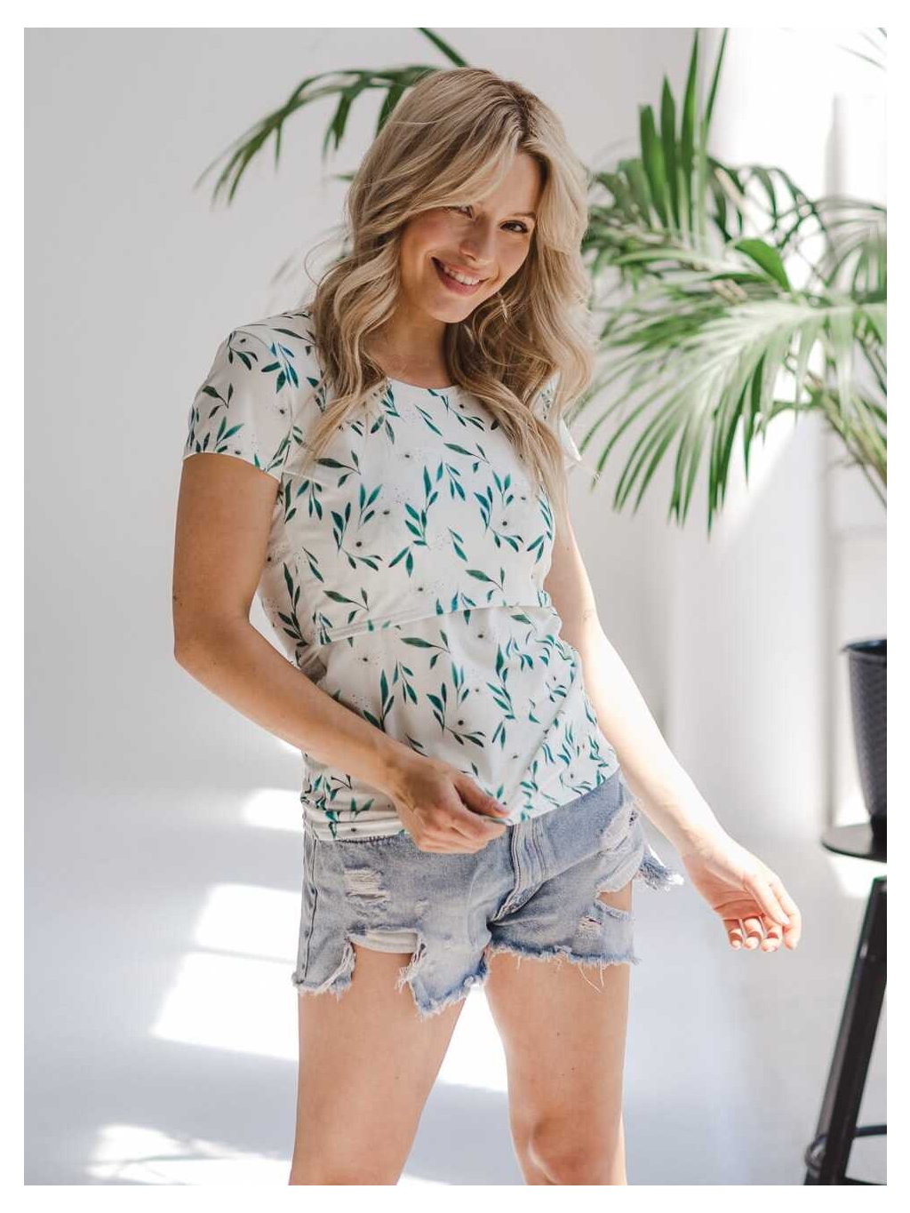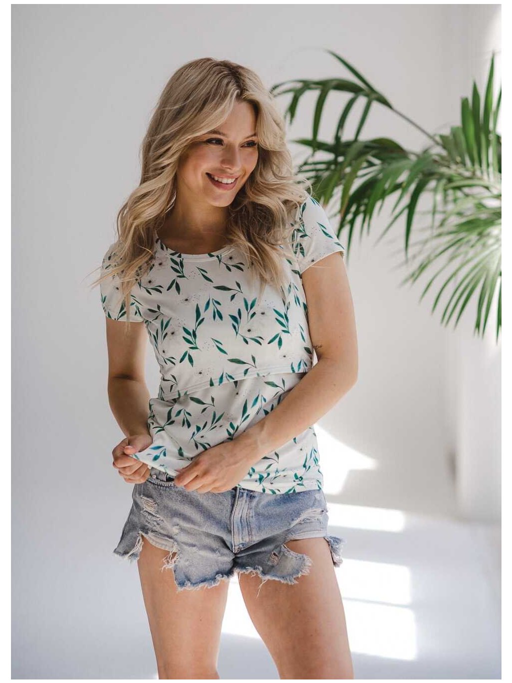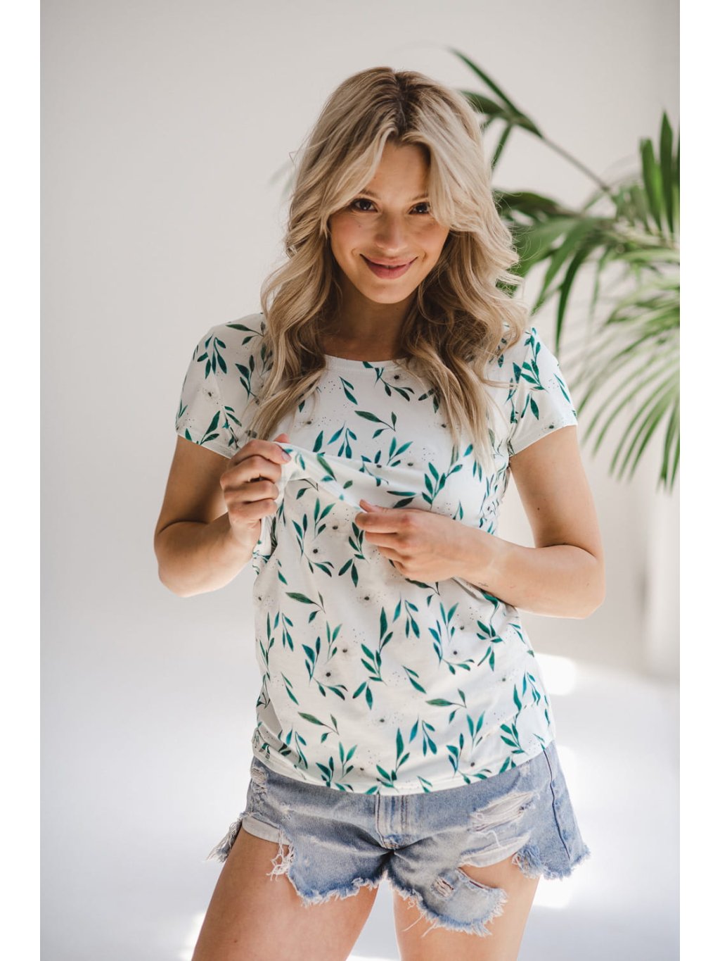 Těhotenské a kojící tričko 3v1 Milk shirt bílé s lístky-kvítky bavlněné