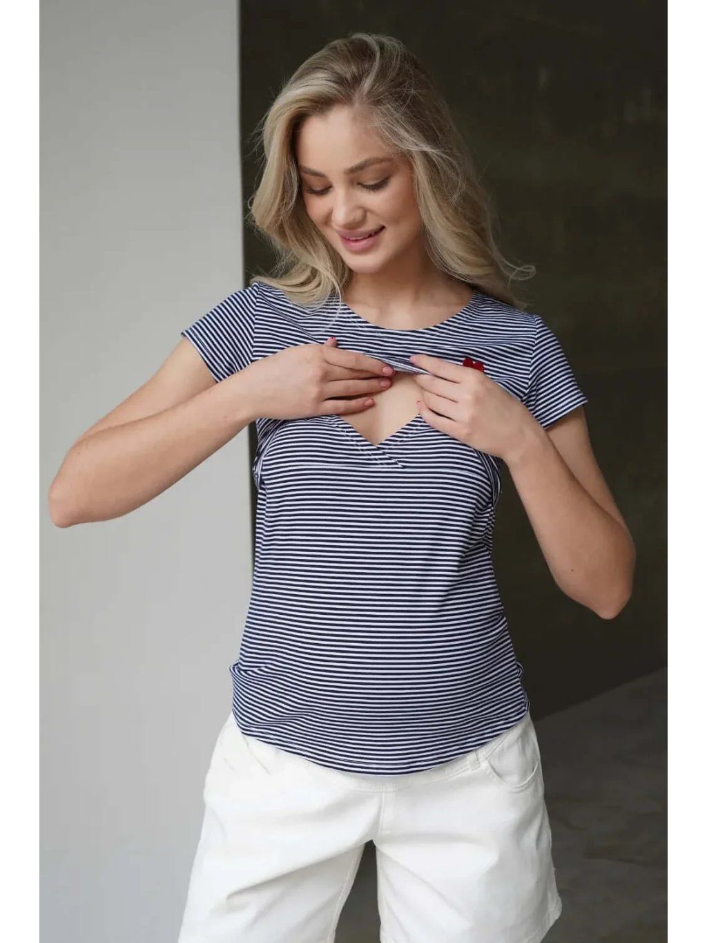 Těhotenské a kojicí tričko Nautic 3v1 – modro‑bílé proužky se srdíčkem