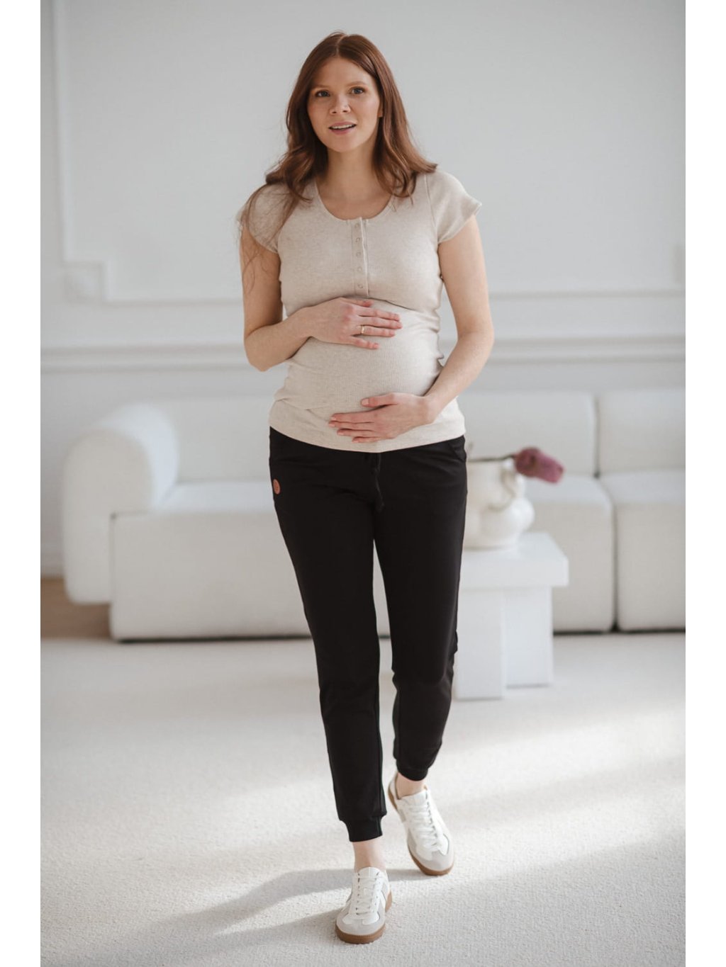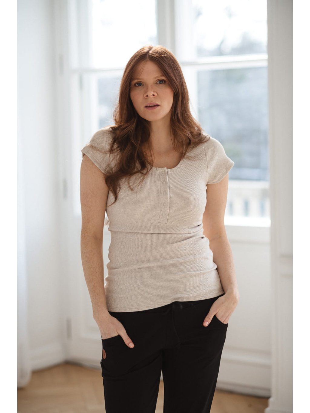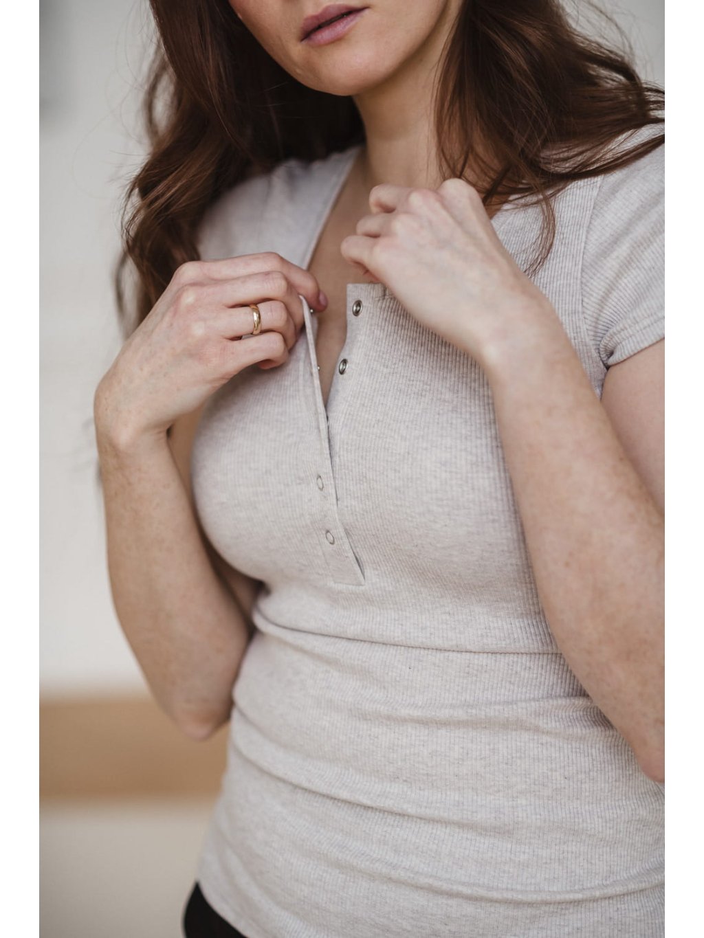 Těhotenské a kojicí tričko Tummy – latté melange, krátký rukáv, žebrovaná bavlna