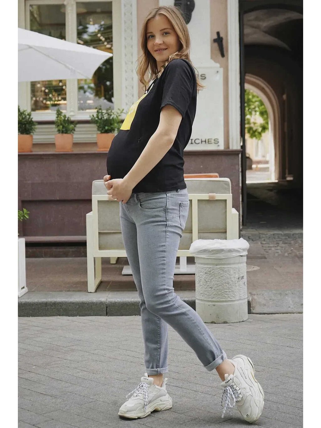 Šedé těhotenské džíny z pevného, ale pružného strečového denimu, které kombinují pohodlí a čistý, moderní vzhled. Mají rovný střih lehce zúžený u kotníků a funkční kapsy vpředu i vzadu, takže působí jako klasické džíny, ale sedí mnohem pohodlněji.