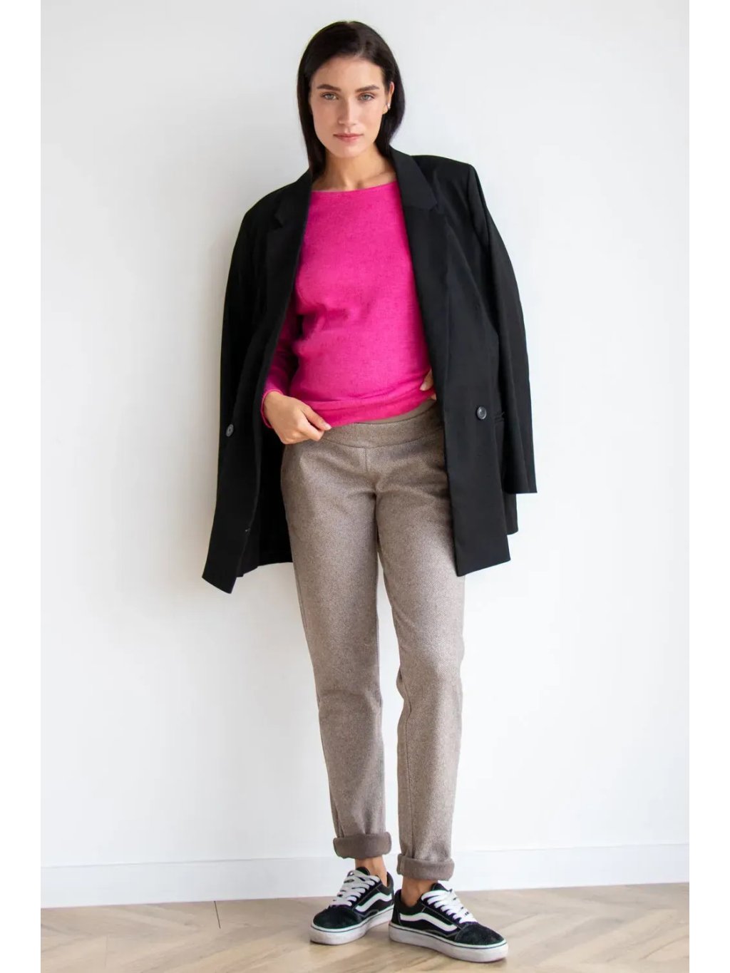Tyto těhotenské kalhoty ve světle hnědé melange barvě jsou ušité z kvalitní tkaniny s vyšší gramáží, která je příjemně hřejivá a zároveň pevná, takže krásně drží tvar. Rovný střih působí elegantně a hodí se do práce, na schůzku i na běžné denní nošení.