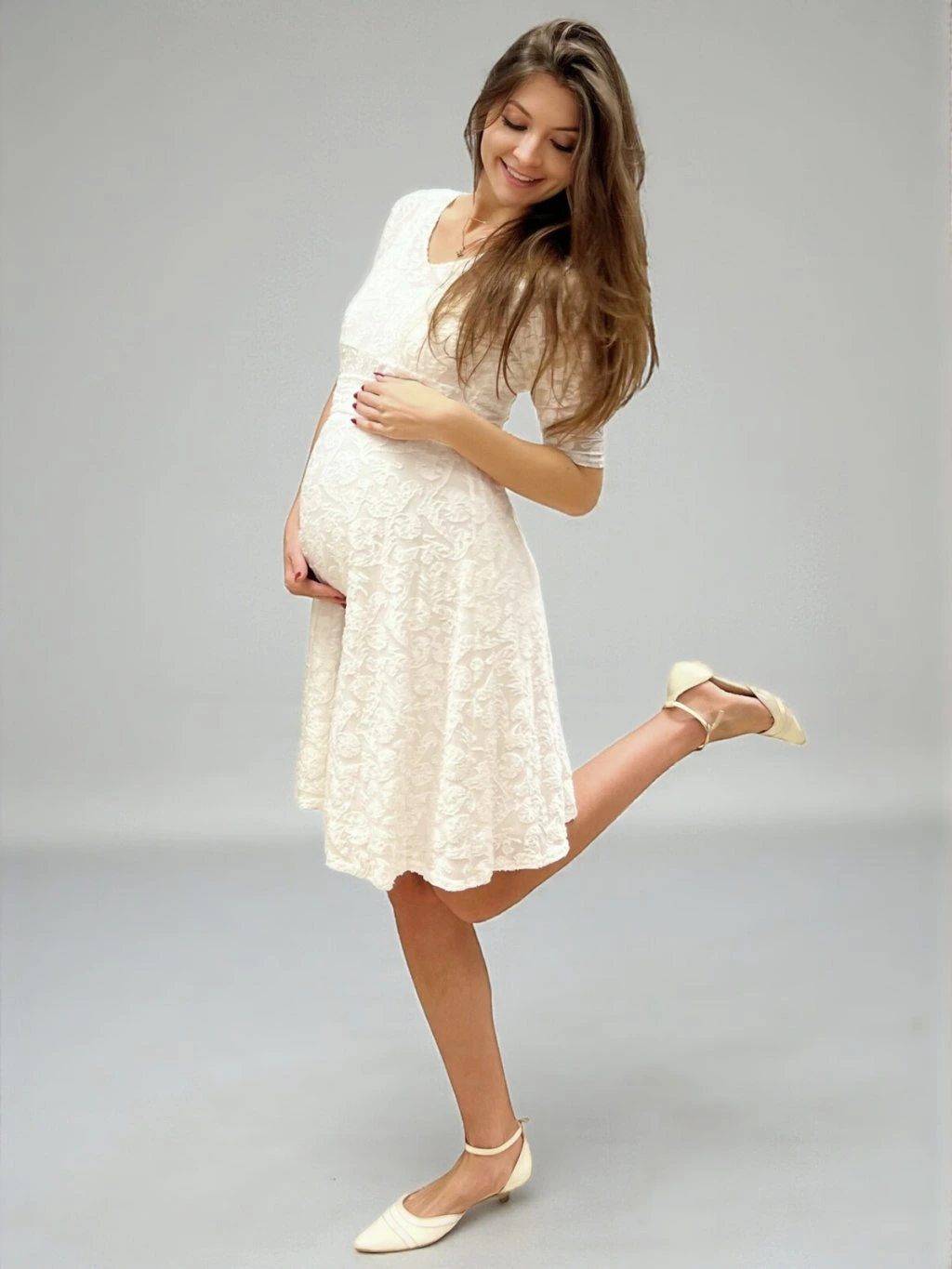 Athea jsou bílé těhotenské svatební šaty v mini délce, které spojují lehkost, pohodlí a jemnou slavnostní eleganci. Celé šaty jsou ušité z jemné krajky s lesklými lístky a podšité měkkou látkou, která je příjemná na těle i při delších událostech.