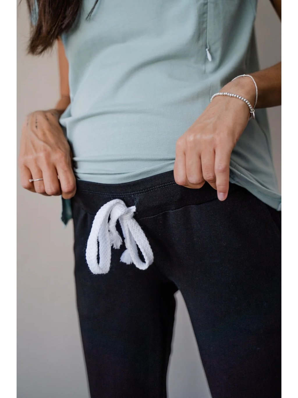 Perfektní těhotenské tepláky, které se dají se nosit třemi způsoby: Můžete jej nosit na, nebo pod těhotenským bříškem a díky stahovací šňůrce...