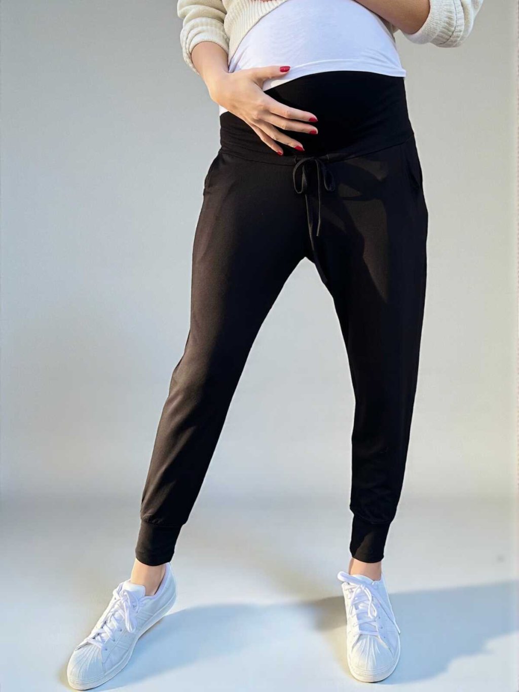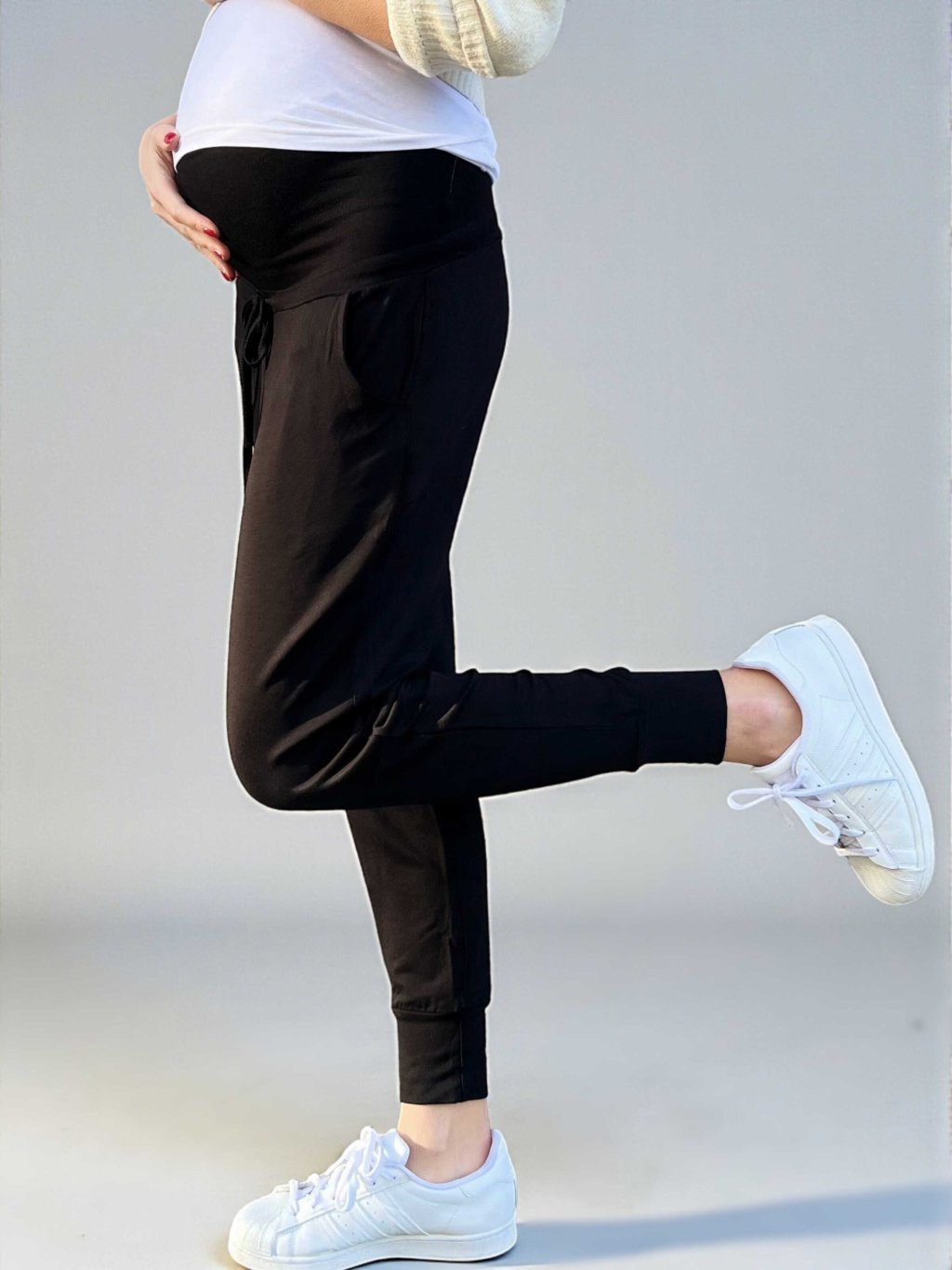 Černé těhotenské tepláky Cairo 2v1 jsou navržené tak, aby se přizpůsobily bříšku v každé fázi těhotenství i období po porodu. Měkký elastický pas můžete nosit přes bříško pro pocit opory, nebo pod ním, pokud chcete volnější pohodlí. Díky nastavitelné šňůrce si tepláky snadno upravíte přesně podle sebe, takže drží tam, kde potřebujete, a nikde netlačí.