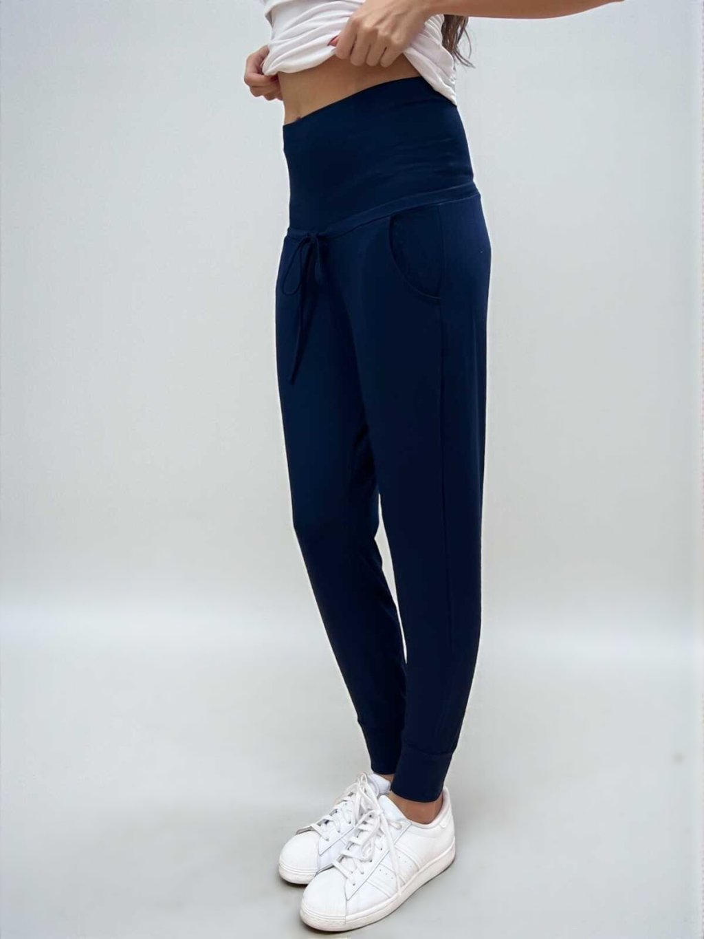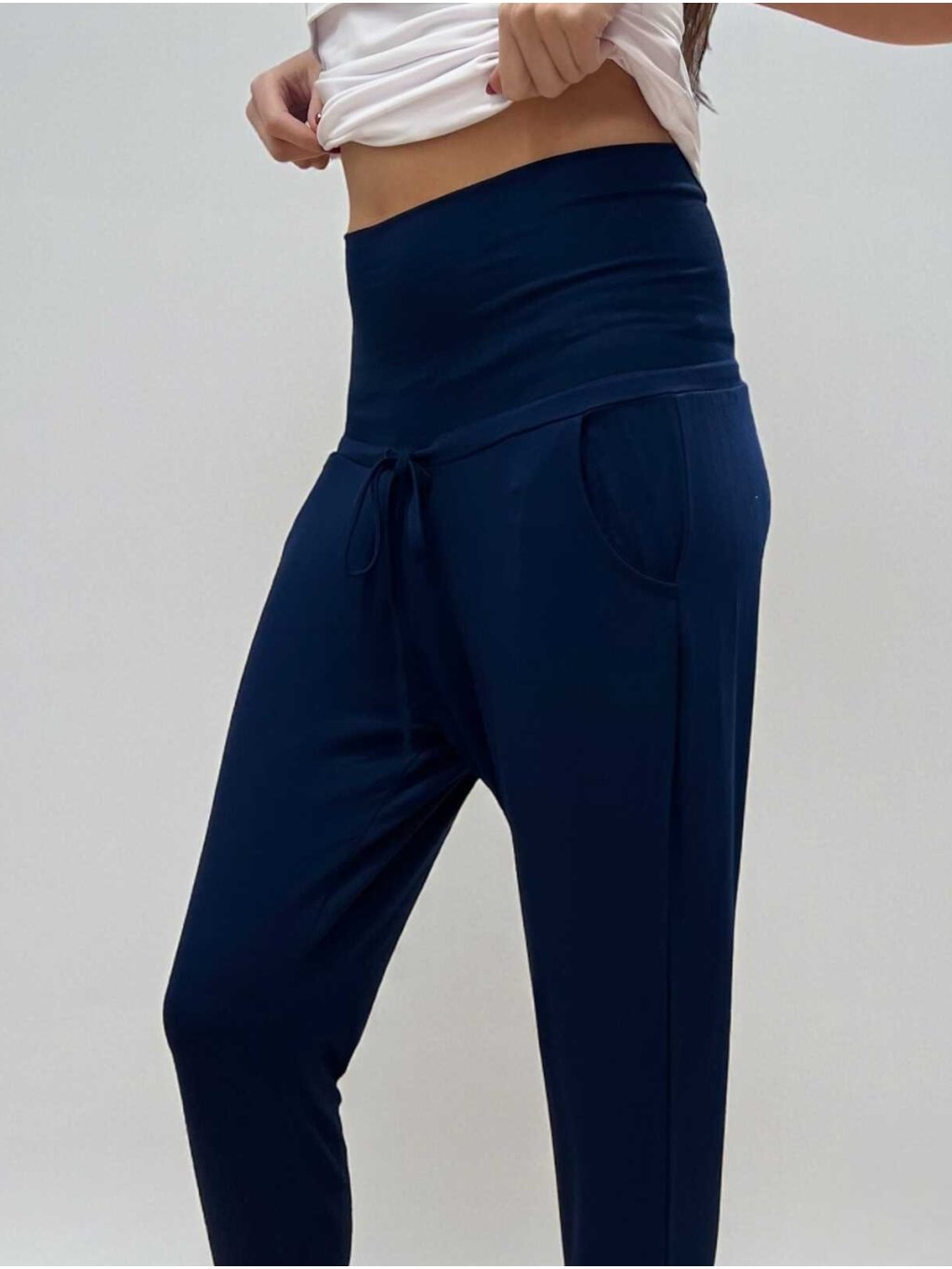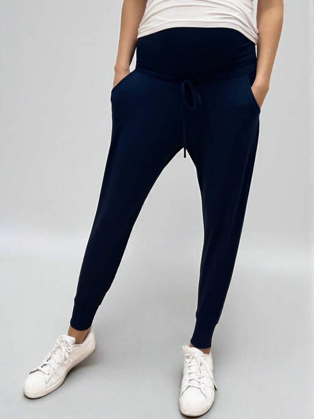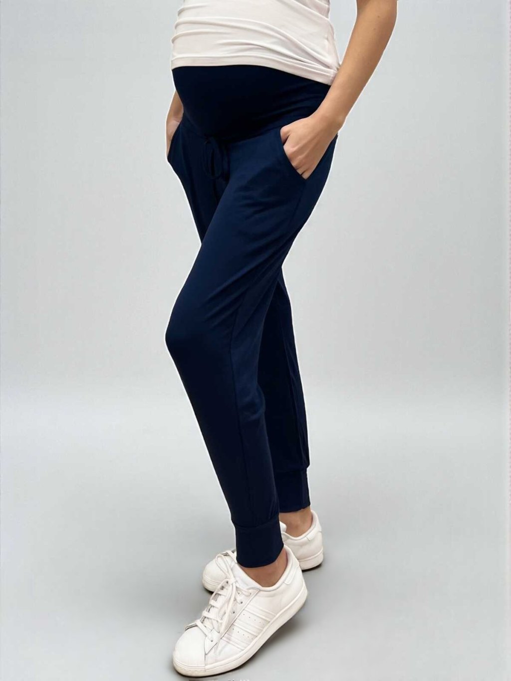 Těhotenské tepláky Cairo 2v1 v tmavě modré barvě jsou vytvořené tak, aby se přizpůsobily bříšku v každé fázi těhotenství i po porodu. Měkký elastický pas můžete nosit přes bříško, nebo pod ním, pokud chcete volnější pohodlí. Díky nastavitelné šňůrce si tepláky snadno upravíte přesně podle sebe, takže drží tam, kde potřebujete, a nikde netlačí.