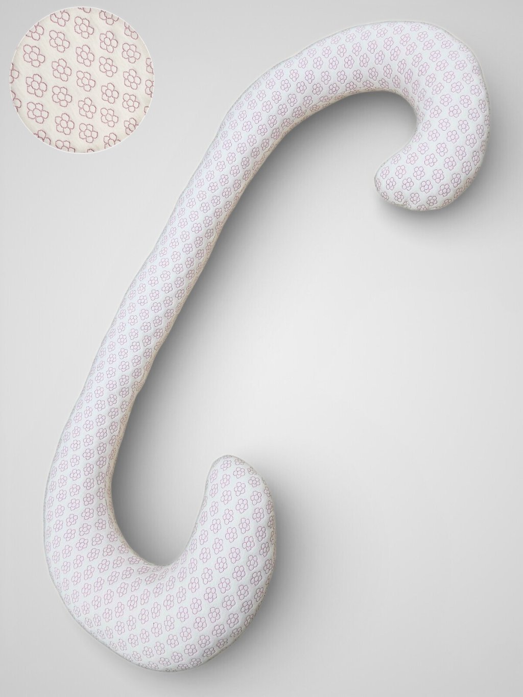 Tento těhotenský a kojicí polštář v jemném ecru odstínu s růžovými kvítky je navržen tak, aby poskytoval pohodlí během celého těhotenství i při kojení. Ergonomický tvar ve stylu „C" a šířka přibližně 160 cm pomáhají uvolnit napětí při spaní na boku a přirozeně podpírají celé tělo.