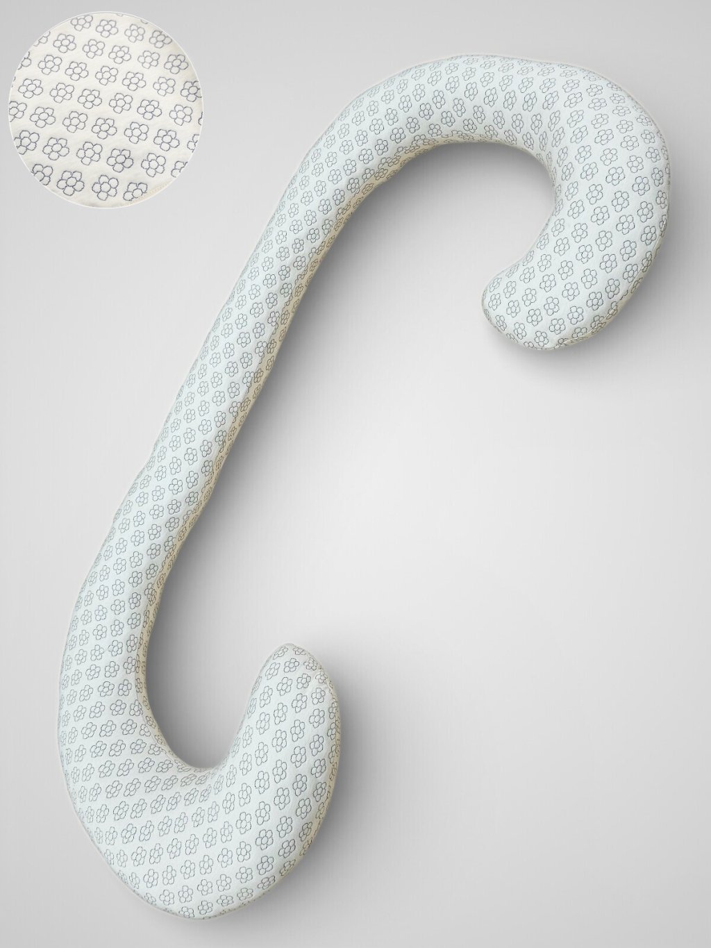 Tento těhotenský a kojicí polštář ve tvaru C v jemném ecru odstínu se šedými kvítky je navržen tak, aby ulevil tělu v každé fázi mateřství. Díky ergonomickému tvaru a délce přibližně 160 cm se přirozeně přizpůsobí postavě a pomáhá najít pohodlnou polohu při spaní na boku.