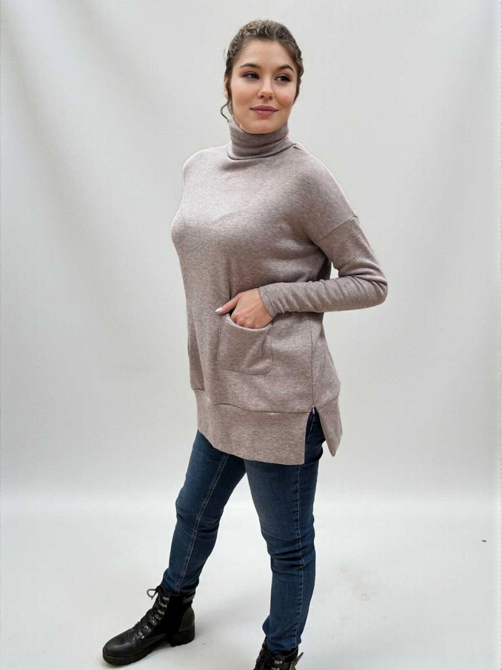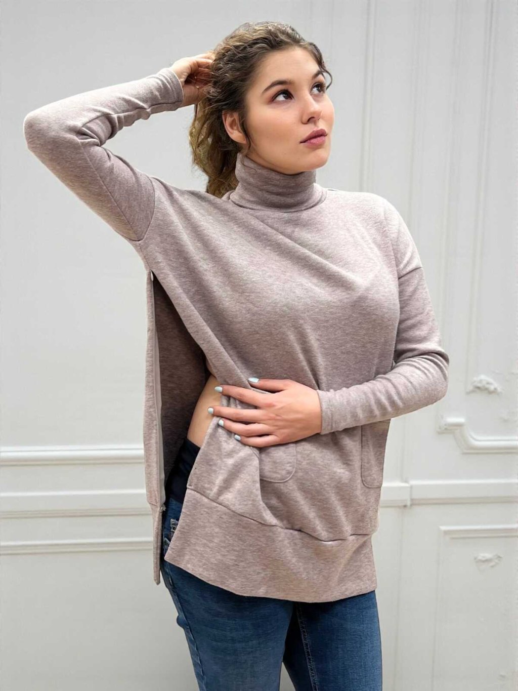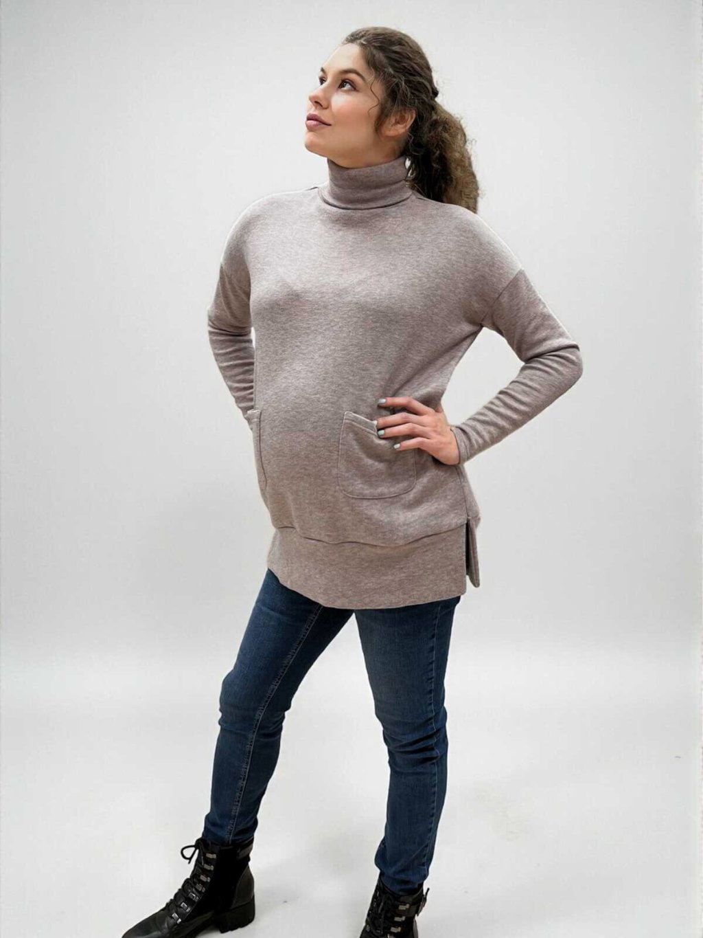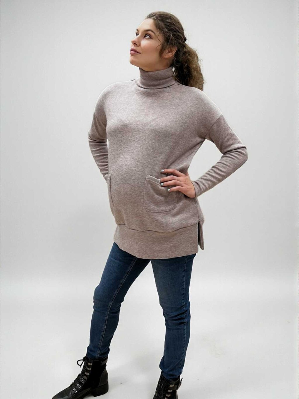 - Běžné nošení: Elegantní design s rolákem a kapsami využijete i po mateřství jako stylový svetr na každý den.