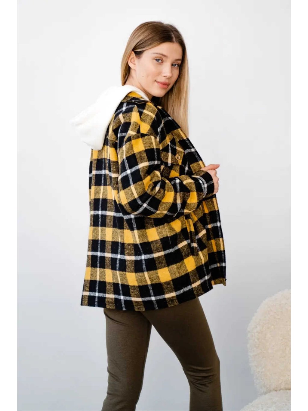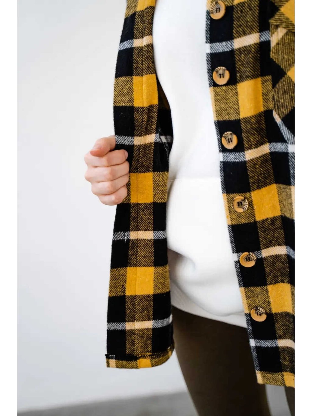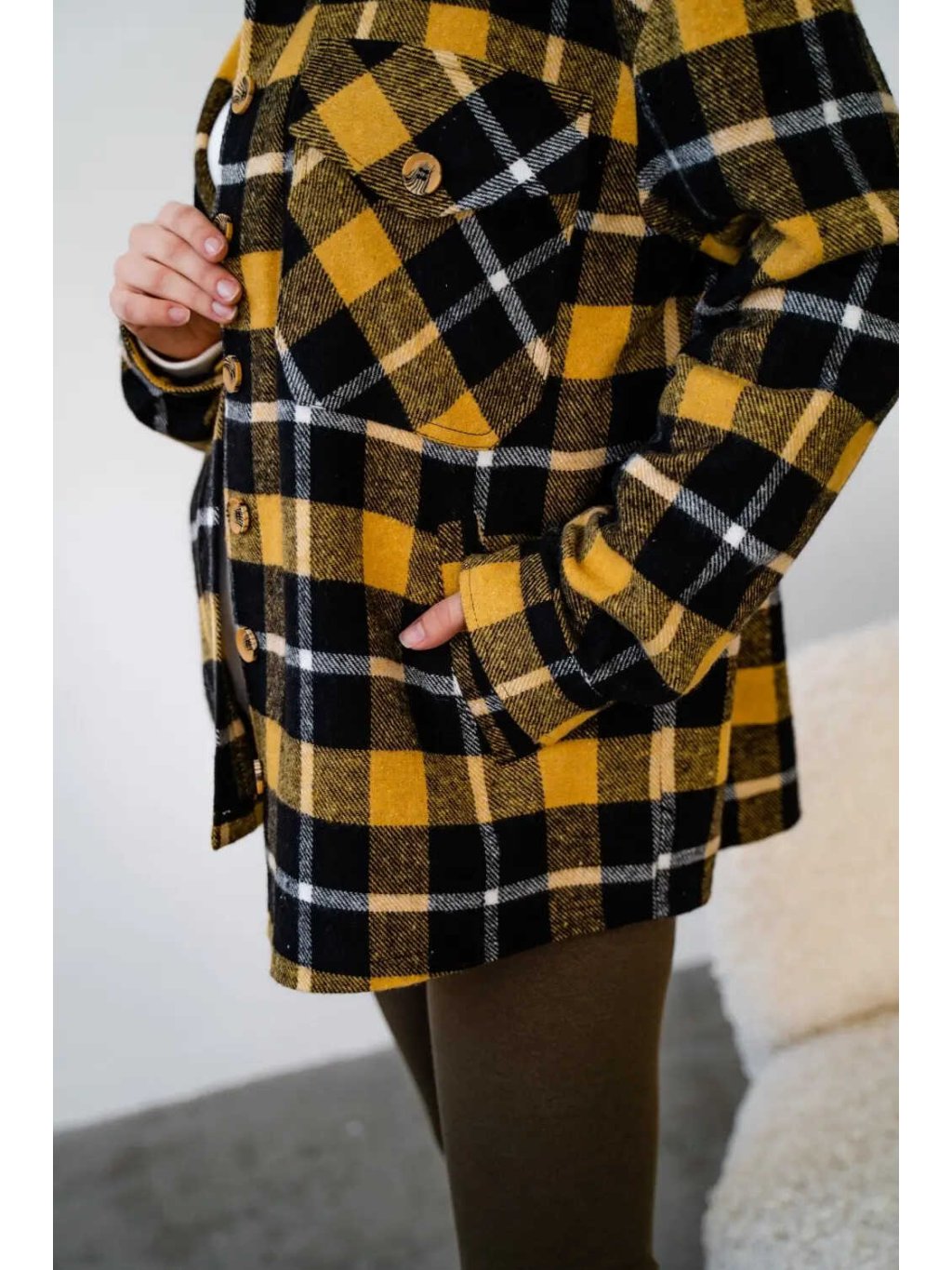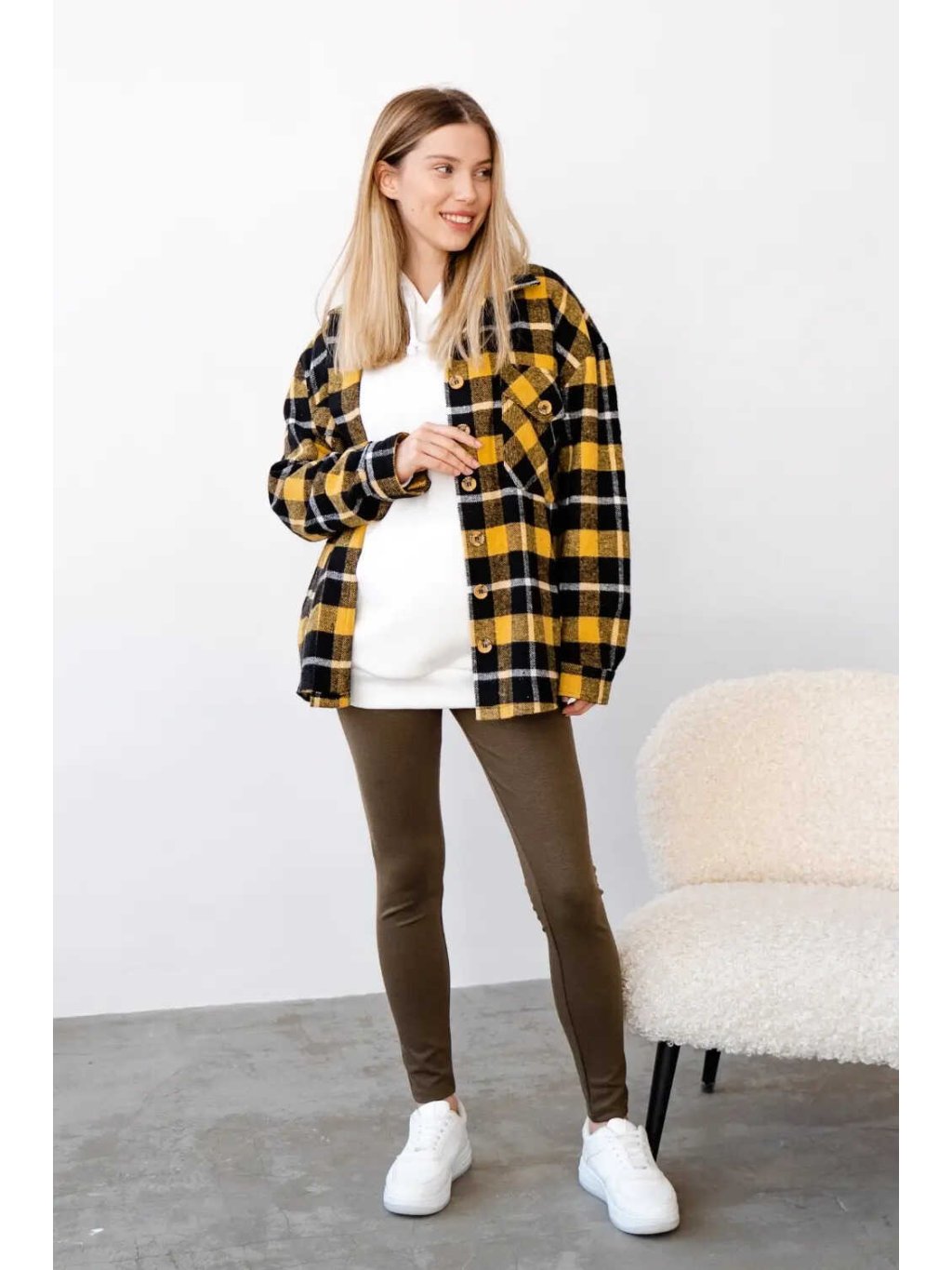Stylová těhotenská košile ve žlutém kostkovaném vzoru je skvělou volbou pro chladnější dny. Teplejší, hustě tkaný materiál příjemně zahřeje a často nahradí lehkou bundu. Oversize střih poskytuje maximální pohodlí a krásně se přizpůsobí rostoucímu bříšku.