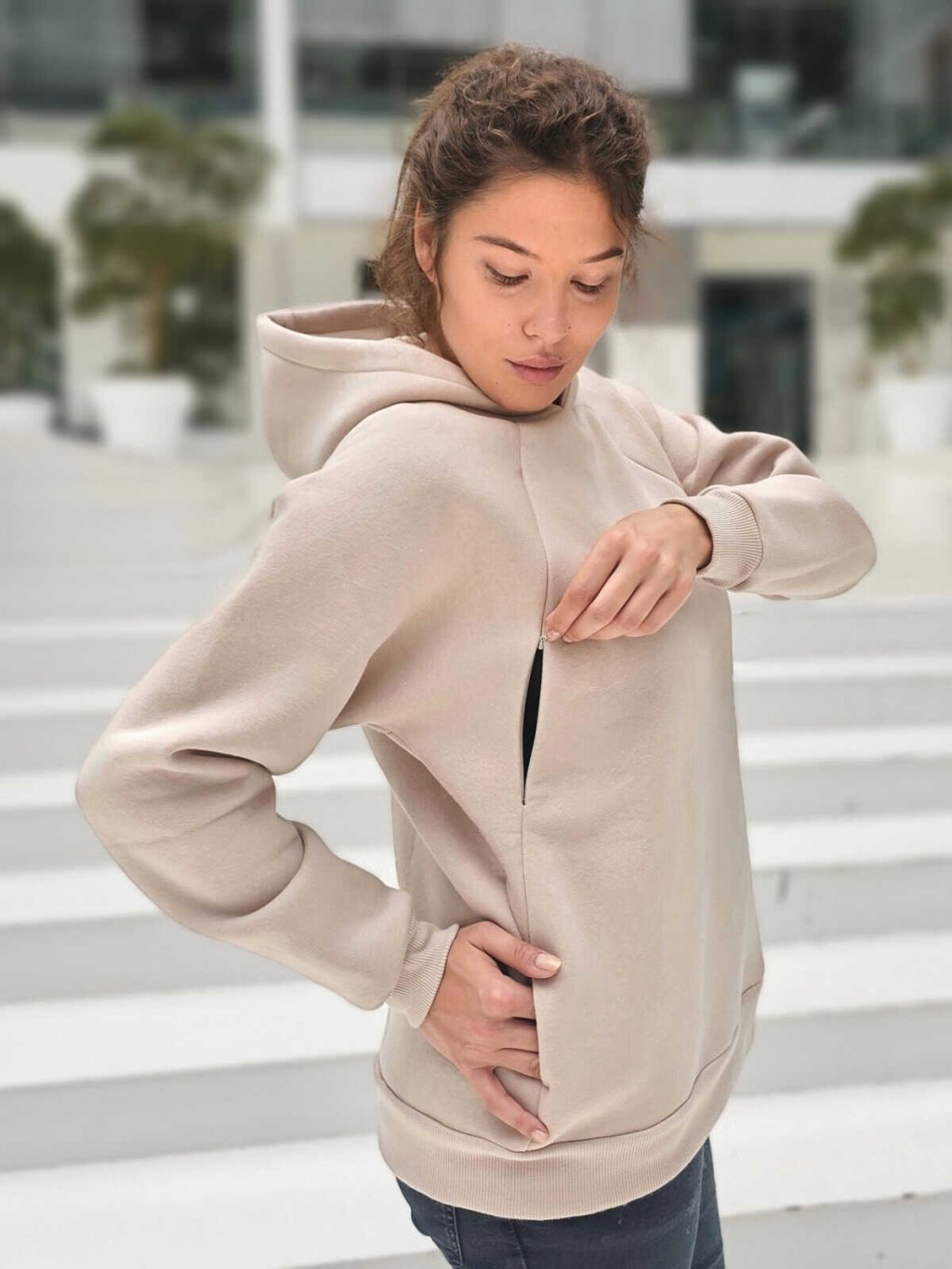 Po narození miminka oceníte skryté zipy, díky kterým se mikina snadno promění v praktickou mikinu na kojení. Umožňuje rychlé a diskrétní kojení doma, venku i na cestách, bez nutnosti svlékat vrstvy nebo odhalovat celé tělo. Světle béžová působí jemně, čistě a krásně doplní jak sportovní, tak elegantnější outfit.