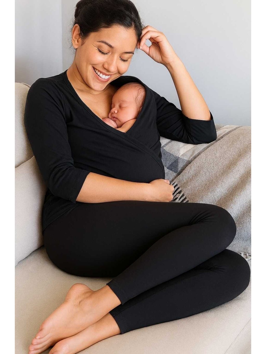 Zavinovací tričko na klokánkování Emberlyn – černé bavlněné, 3/4 rukáv