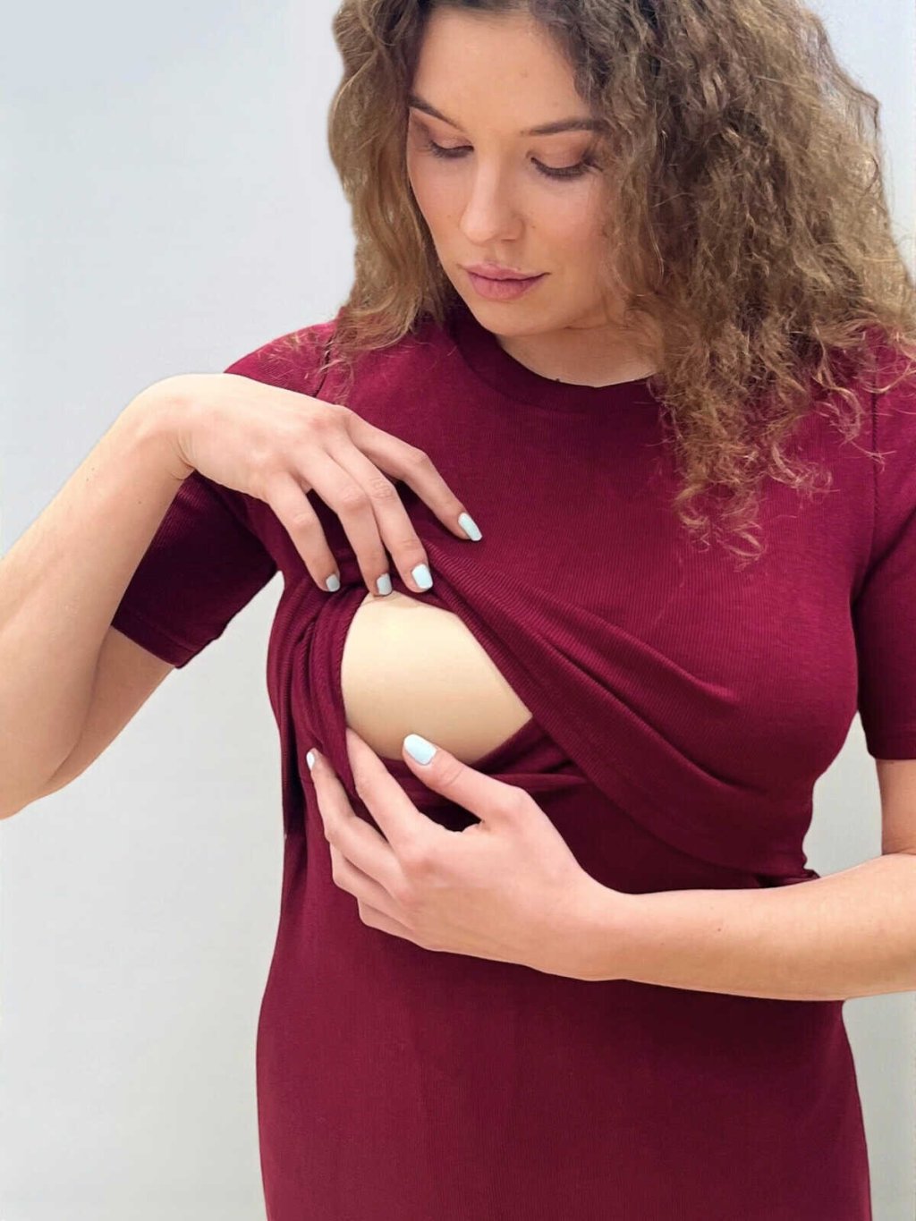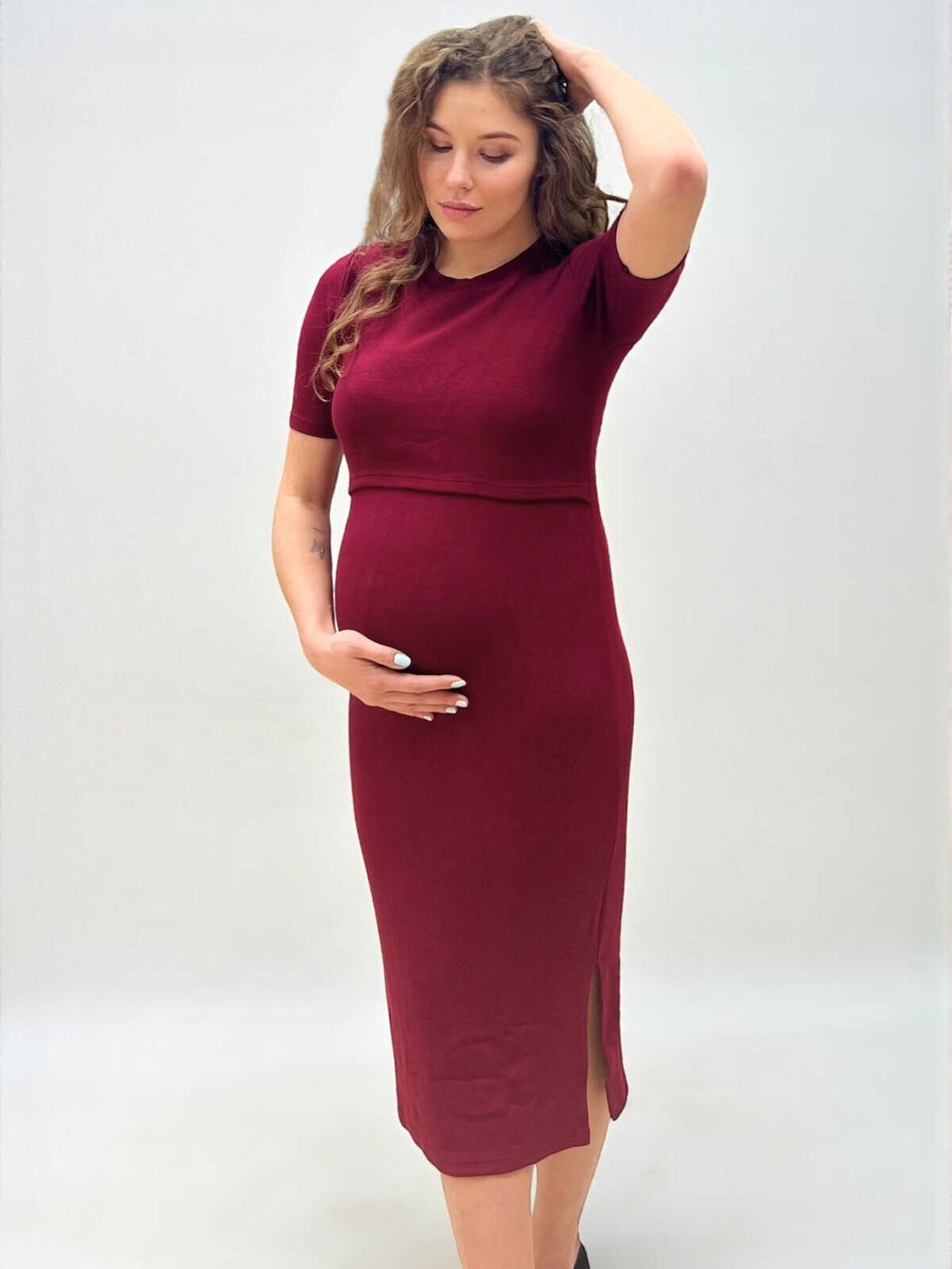 Elegantní těhotenské šaty Kristin v odstínu burgundy jsou navržené tak, aby vám dodaly pohodlí i sebevědomí v každé fázi mateřství. Ženský tužkový střih krásně zvýrazní rostoucí bříško, zatímco prémiový žebrovaný úplet se dokonale přizpůsobí postavě a zůstává příjemně elastický.