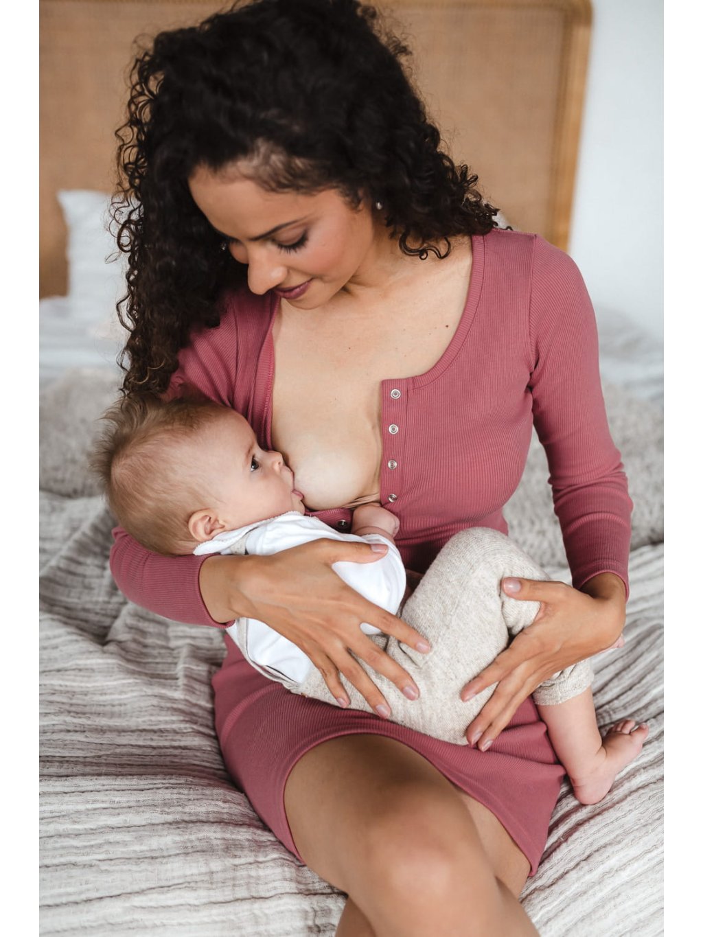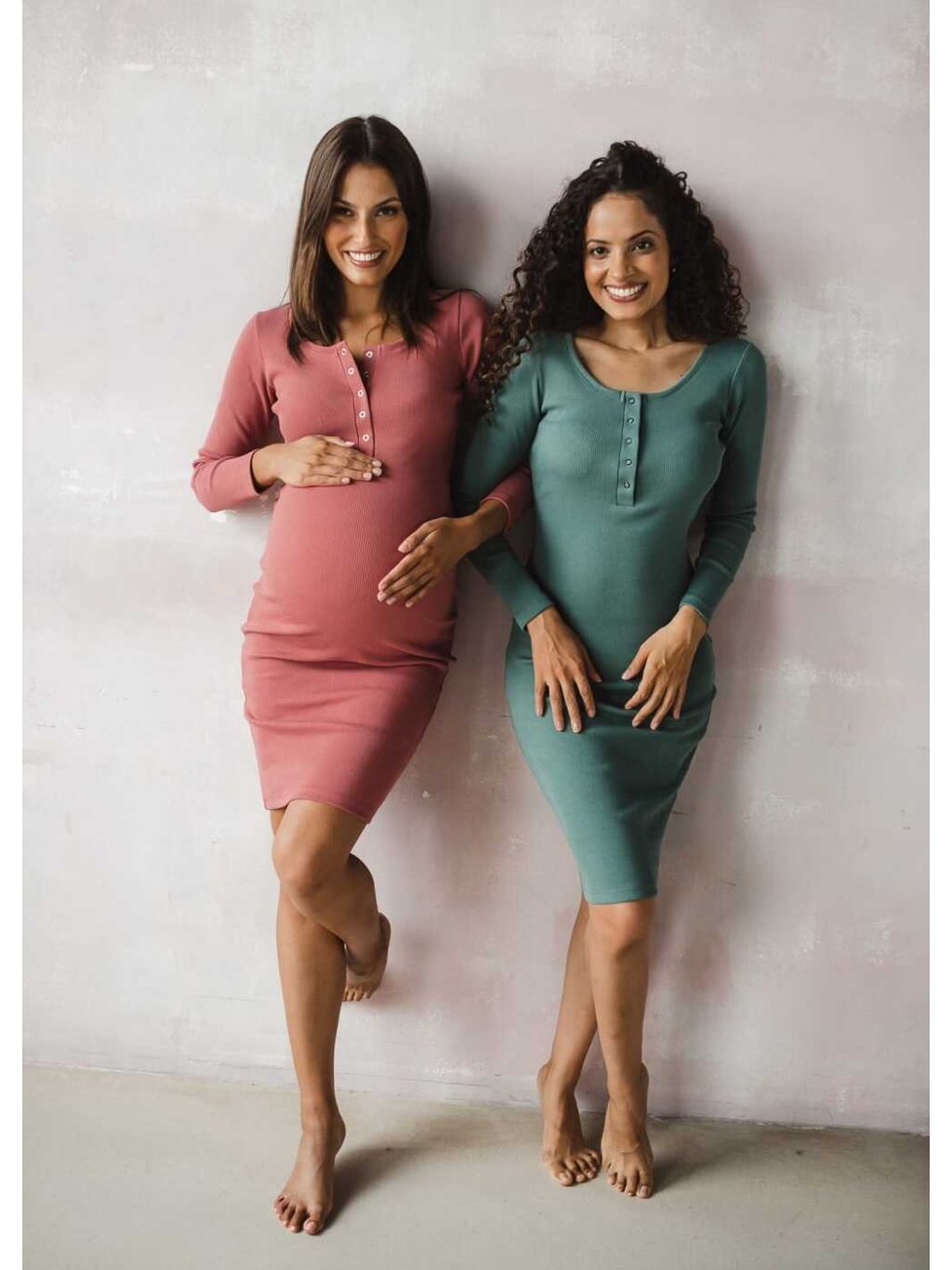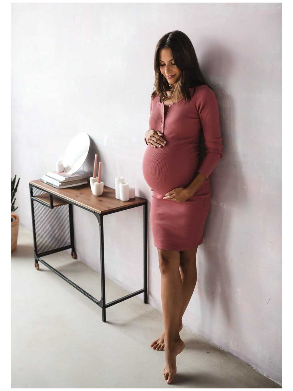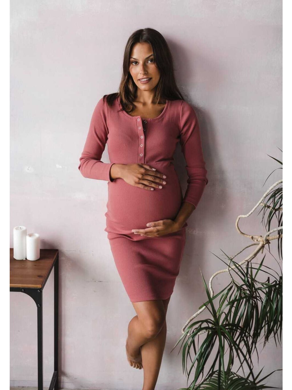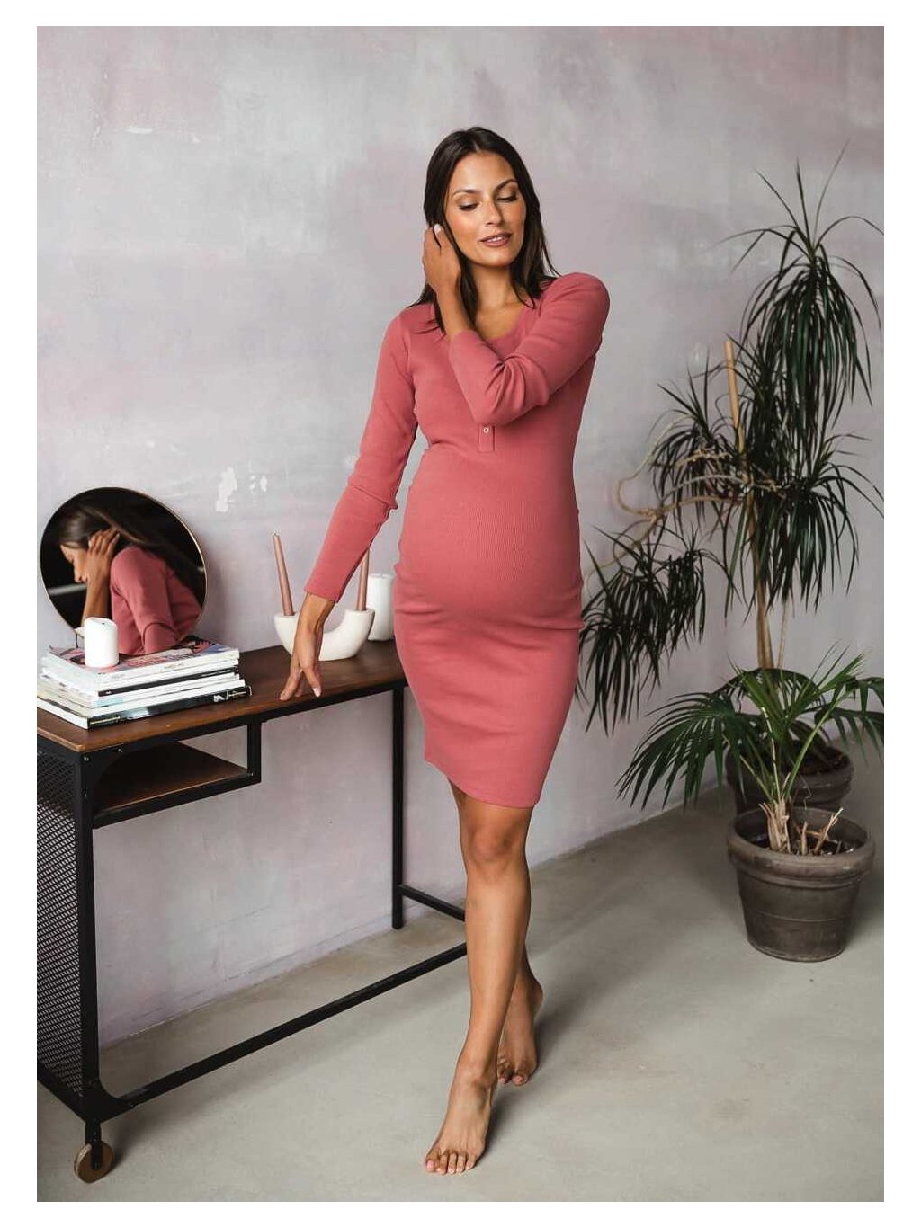 Žebrované těhotenské a kojící šaty Tummy dusty cedar bavlněné dlouhý rukáv