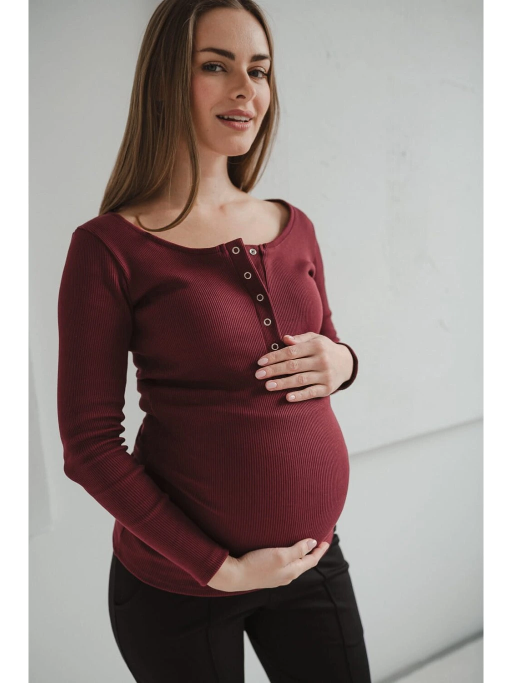 Těhotenské a kojicí tričko Tummy – bordó, dlouhý rukáv, žebrovaná bavlna