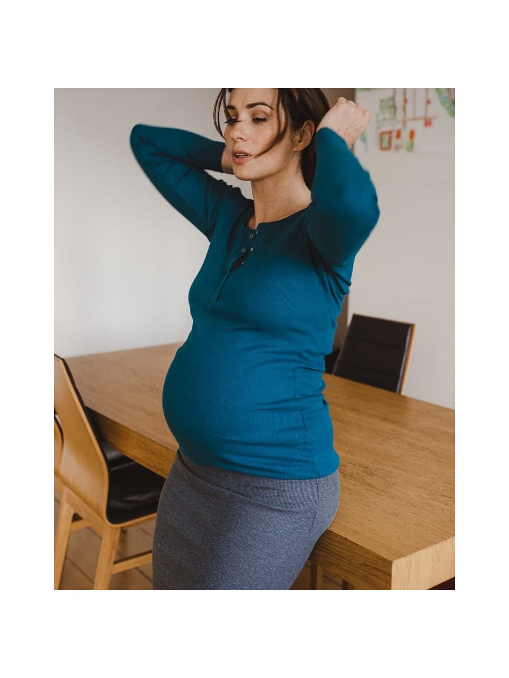Těhotenské a kojicí tričko Tummy – modrá Poseidon, dlouhý rukáv, žebrovaná bavlna